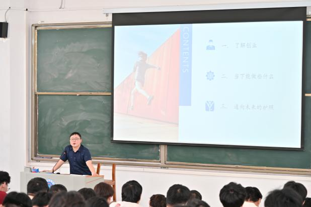 优秀员工陈龙作为主讲嘉宾,分享了其创办企业的奋斗历程。在校期间即开启创业之路,2018年通过家政服务实现学费生活费自理,同年创立公司。面对2019年底突发的经营困境,他带领团队坚定信念,突破创新,将公司从单一清洁服务拓展至批发零售、3D打印、装饰装修等多领域,形成12人专业团队。关于创业,他的感悟是“越努力,越幸运”,不怕困难,勇于创新,成功在于一步步坚持;他特别强调"目标导向、团队协作"的重要性,用"创业就是不断解决问题的过程"激励在场学子。